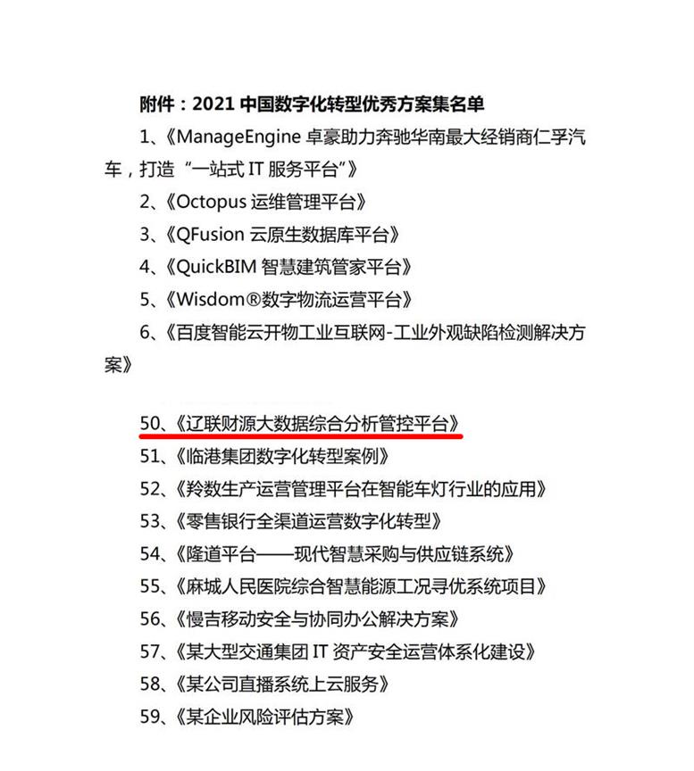 2022年1月18日,“2021第五届中国软件和信息服务业年度风云榜”评选结果正式发布。华为、腾讯、科大讯飞、神州数码、中兴通讯等企业获评“2021中国软件和信息服务业十大领军企业”。辽联信息荣获“2021中国软件和信息服务业年度影响力企业”,辽联财源大数据综合分析管控平台入选《2021中国大数据应用样板100例》。