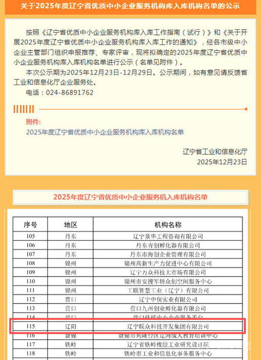 近日,辽宁省工业和信息化厅下发《关于公布辽宁省优质中小企业服务机构名单的通知》,公示名单共计122家企业。辽联集团凭借在数字服务领域的突出贡献与行业影响力,成为辽阳市唯一入选企业。这一荣誉是对集团其长期深耕服务中小企业、推动数字化转型、赋能企业高质量发展的充分认可。